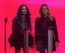 Mixi Demner from Stitched Up Heart wears a custom piece inspired by SCATHED's S/S 2026 Collection on stage at the SHE ROCKS Awards 2026 in Los Angeles.