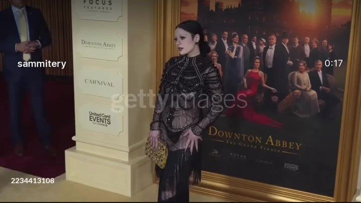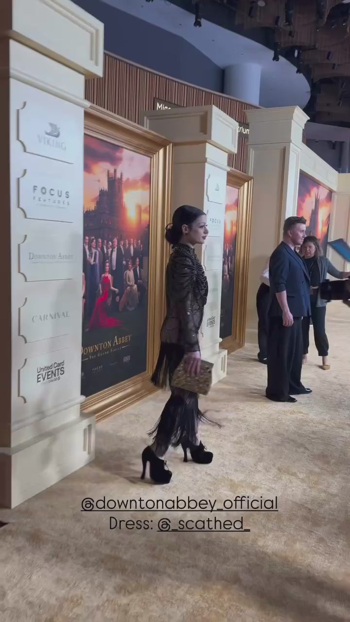 Content creator Samantha Lubrano (@sammitery) made a striking appearance on the red carpet at the Downtown Abbey premiere wearing SCATHED. As a rising voice in entertainment and sustainable, cruelty-free fashion, Samantha brought SCATHED's vision of sustainable luxury couture to the spotlight wearing the Morta Beaded Dress from the REAPER F/W 2025 collection.