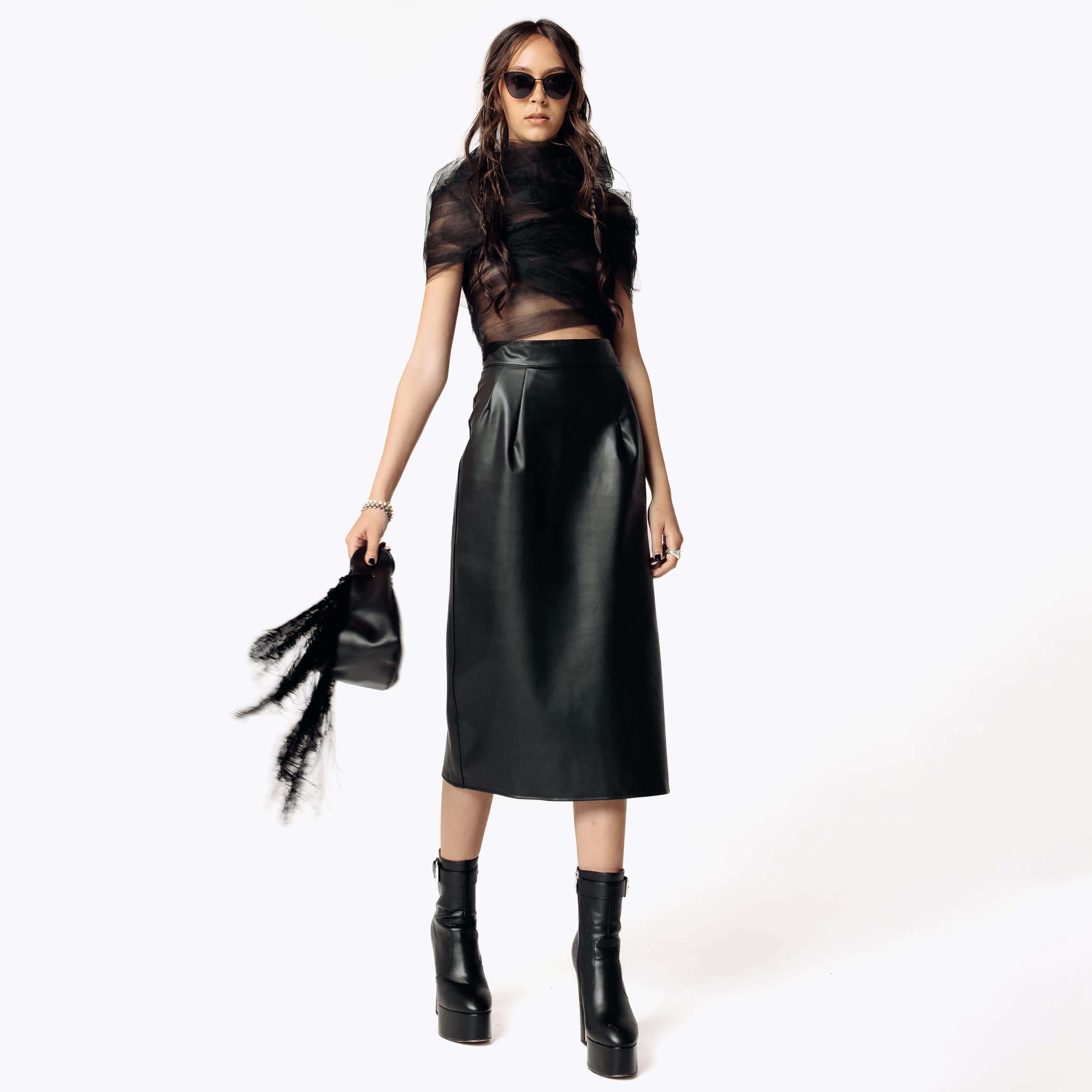 The Ankou Cactus Leather Midi Skirt is structured darkness, tailored high at the waist and cut to a sleek, fitted silhouette. Crafted from sustainable cactus leather, it blends cruelty-free luxury with a gothic edge. Chic, architectural, and unyielding, this skirt is an armor of elegance — a piece that turns minimalism into menace. Pair it with sheer silks or heavy layers, and step into a silhouette sharpened by both beauty and ruin.