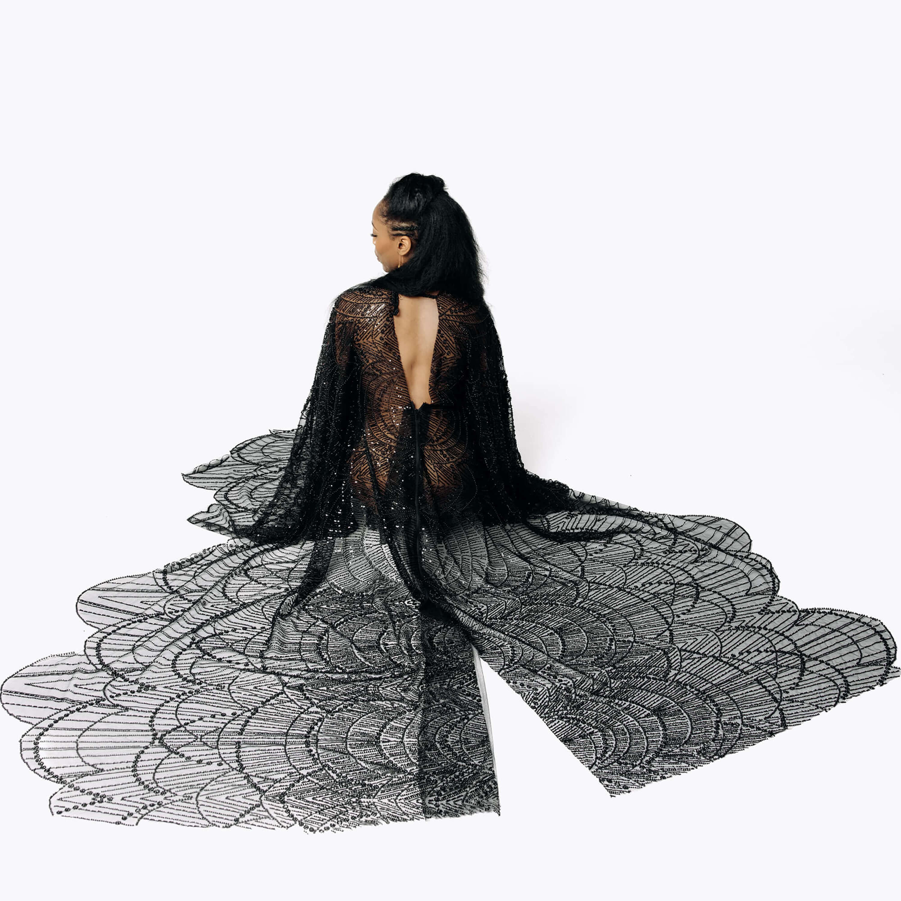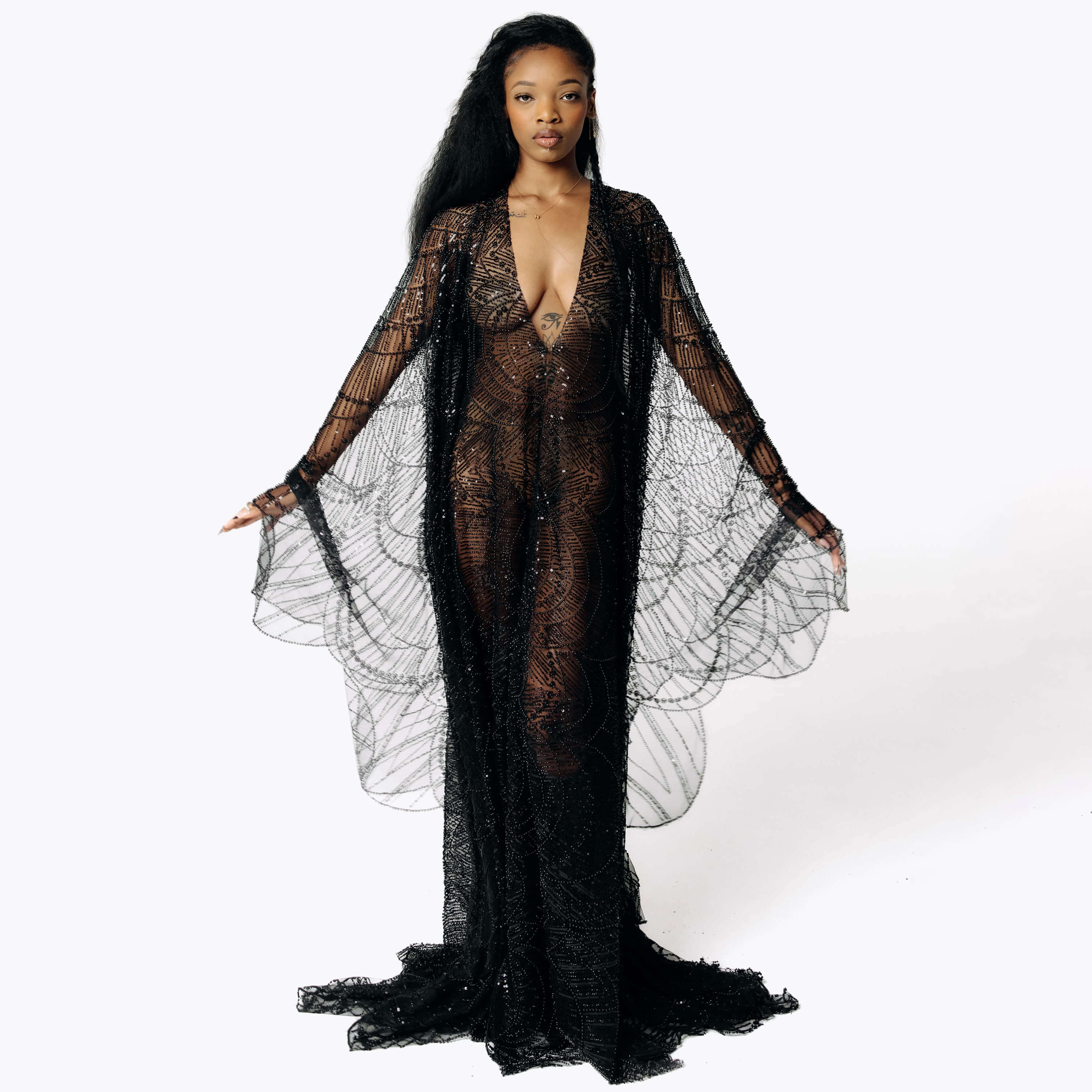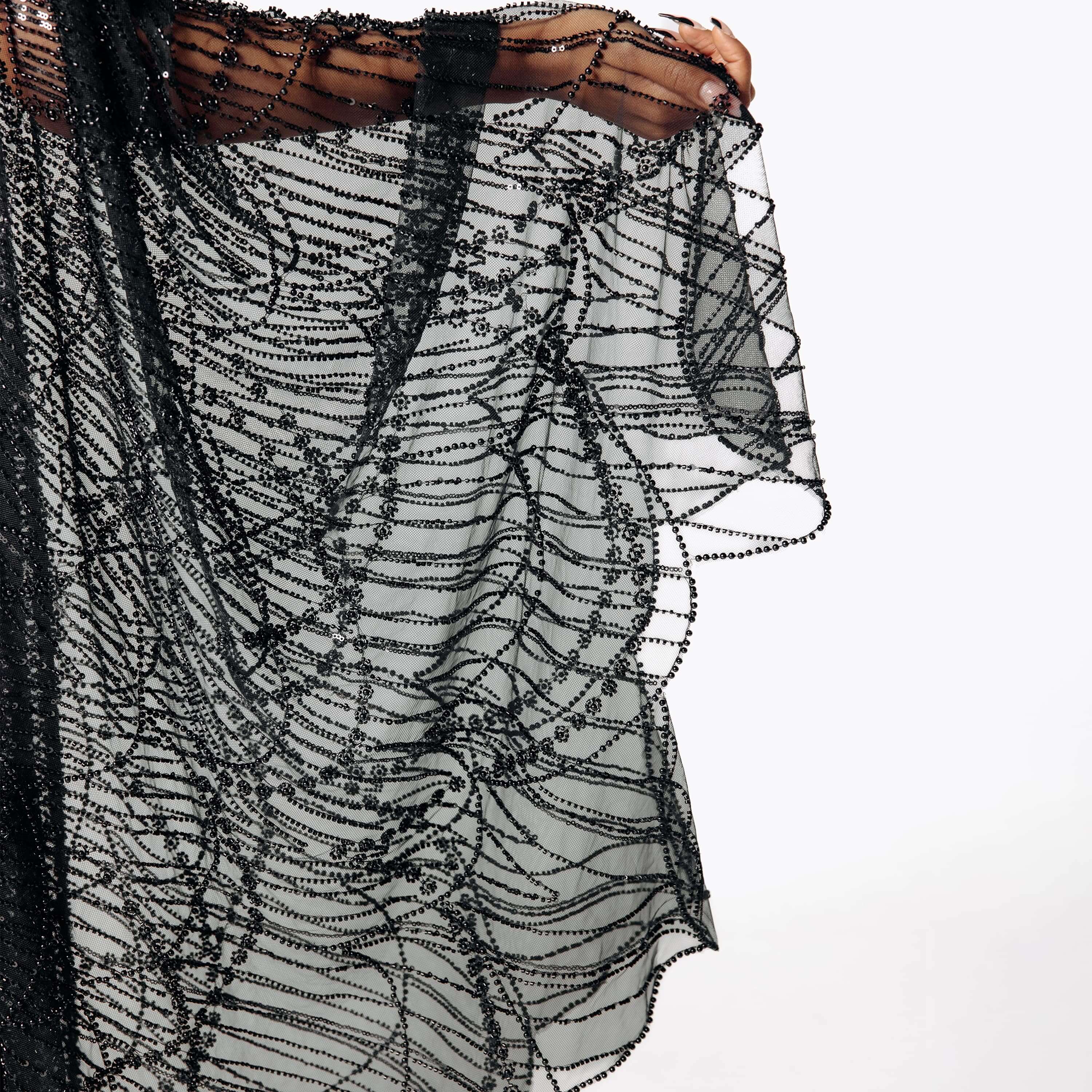 A gown hand-stitched from shadows and sharp edges, the Azrael dress is a poetic ode to the allure of the dark. Fully sheer and drenched in hand-beaded details, it glitters like broken glass in candlelight. Its winged dress silhouette spreads wide, part cathedral window, part omen - transforming the wearer into something between a dark angel and a beautiful threat. This sheer dress embodies the core of SCATHED's mission: to celebrate the resilience born from sorrow. This beaded dress is not for the faint of heart, but for the scarred queens who find power in the shadows and wear their past with pride. It is a piece of armor, a garment that tells a story, and a powerful statement of elegance forged from pain.