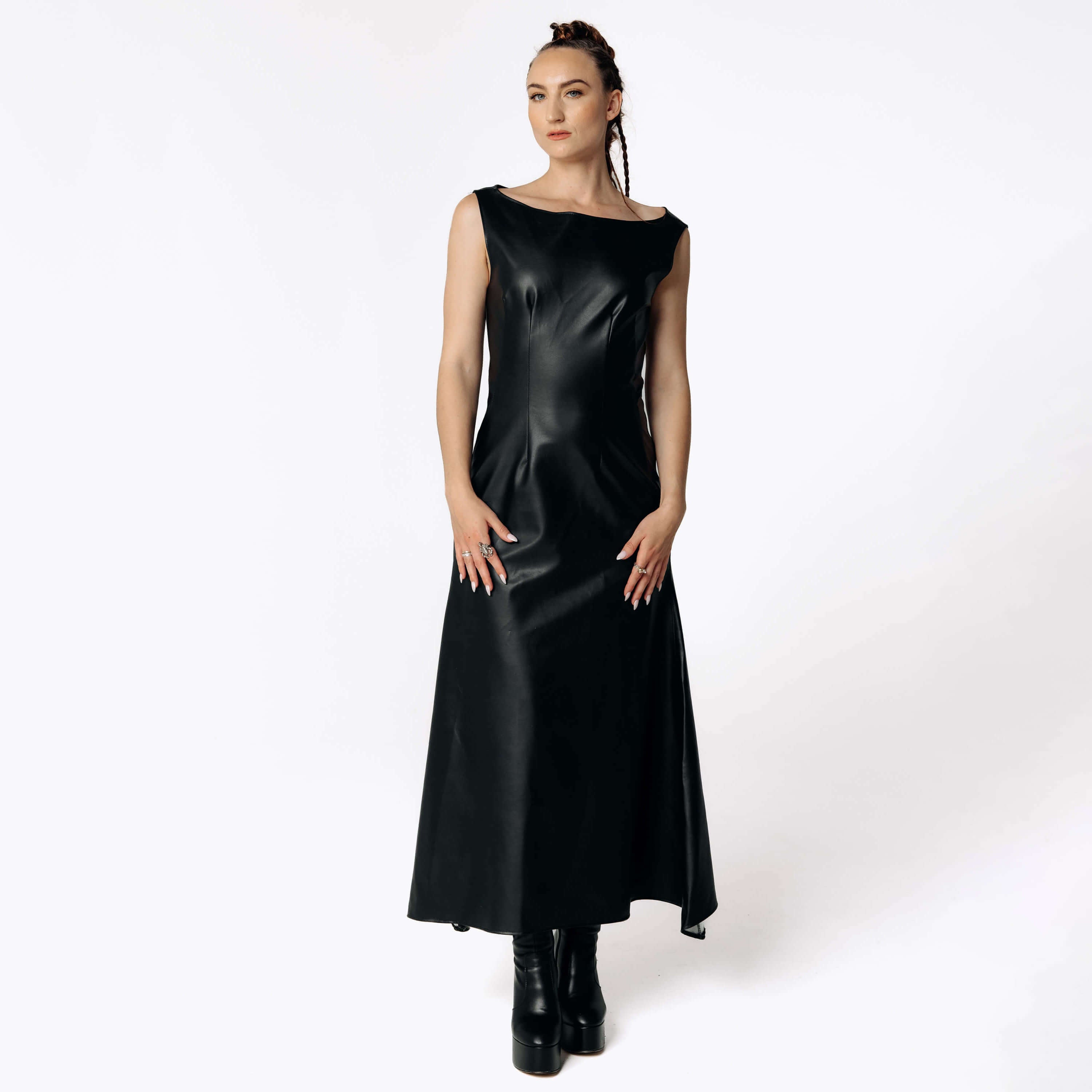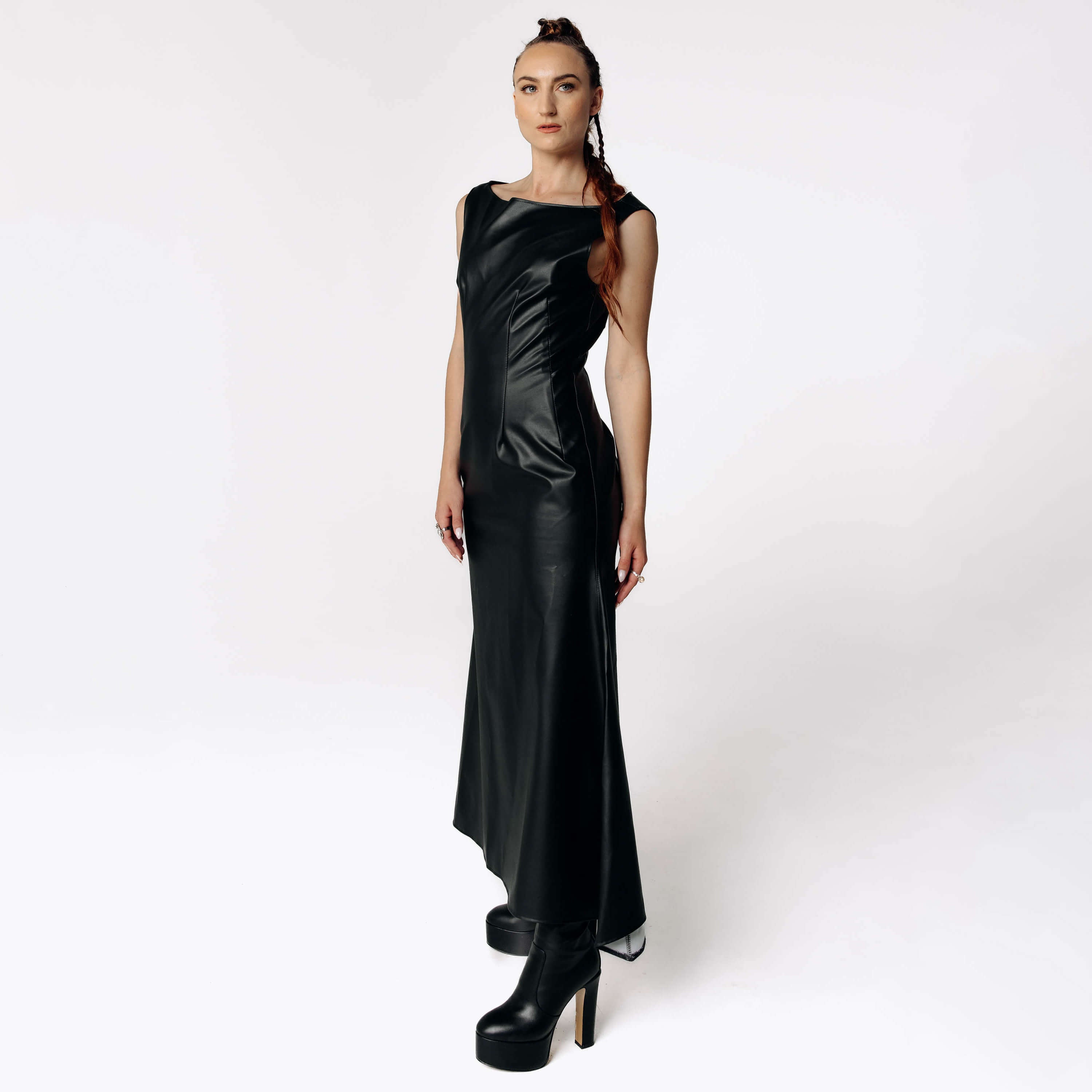 The Kalma Gothic Gown is austerity made tangible — a fitted cactus leather dress that flows into a subtle flare at the hem. Where the rest of the collection dazzles in ornament and shadow-play, this piece wields its simplicity like a blade. Sleek, sculptural, and chic. Crafted from sustainable cactus leather, the dress honors both earth and afterlife — an offering of cruelty-free luxury for the dark minimalist.