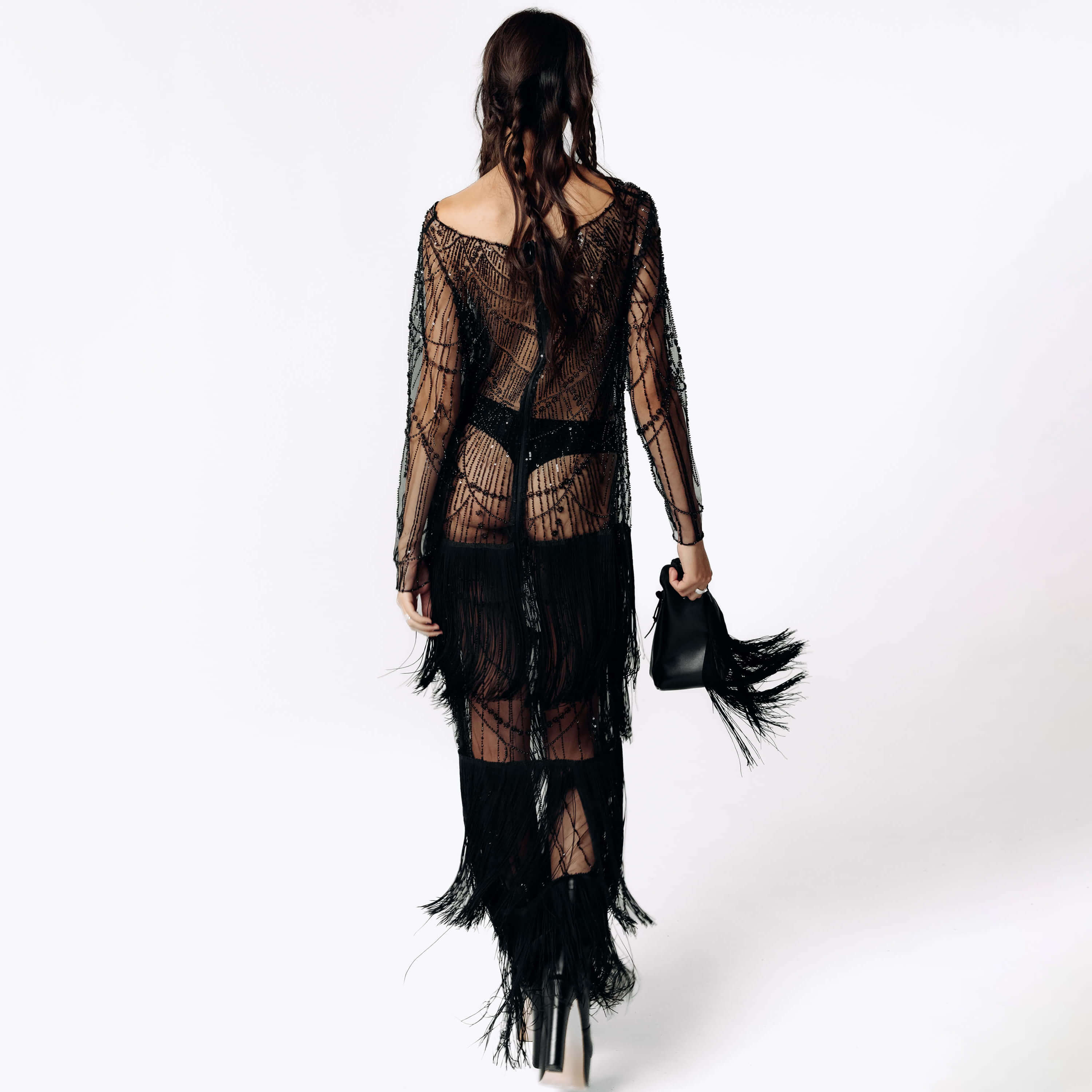 The Morta Dress is an apparition woven from shadow and light, a testament to the powerful duality of faith and defiance. This sheer dress, crafted from black mesh, is adorned with intricate hand-beaded details that catch the light like a whispered secret with every movement. A hand-sewn rhinestone cross on the bodice stands as a bold centerpiece, a silent declaration of strength and rebellion. The skirt features two dramatic layers of fringe, swaying with fluid motion to create a ghostly silhouette that mirrors the brand's reverence for the spectral. Designed to sculpt and empower, this black mesh dress balances transparency with texture and daring with delicacy. A powerful beaded dress that is more than a look; it is a confession for the dark romantic.
