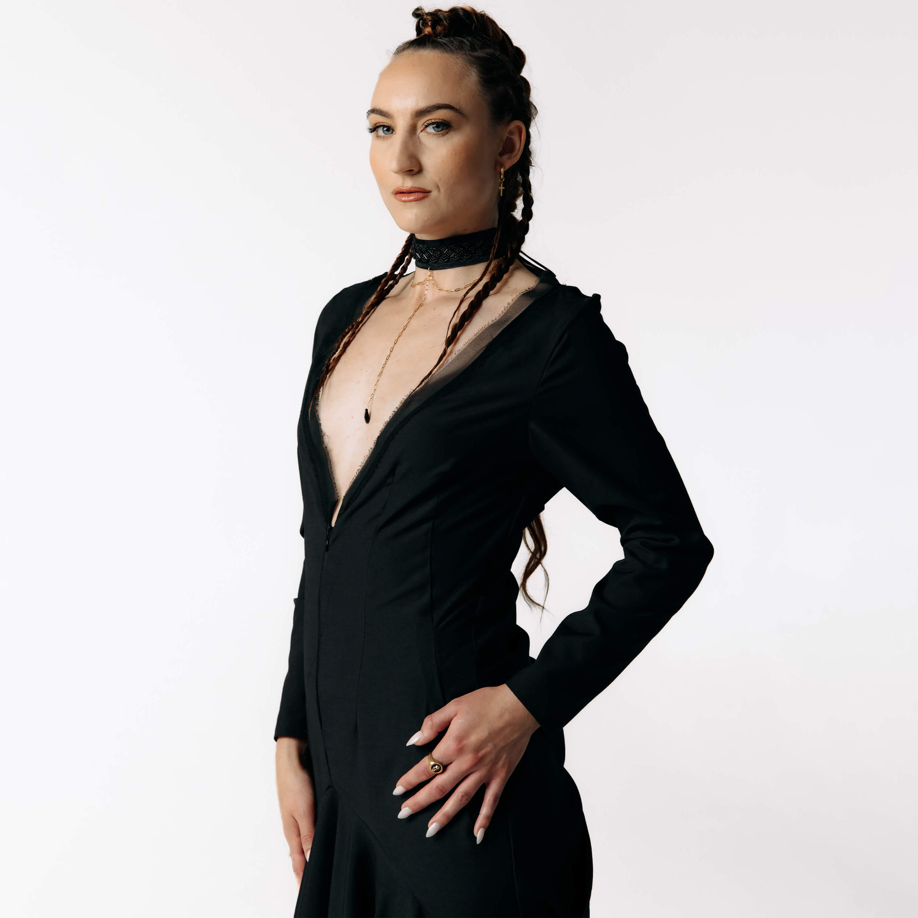 A black gothic dress crafted from organic bamboo cotton, featuring skeletal smocking down the back, a dramatic full skirt, and a drop waist. Finished with a plunging V neckline, it blends eerie romance with sustainable design - an elegant silhouette with a shadowed edge.