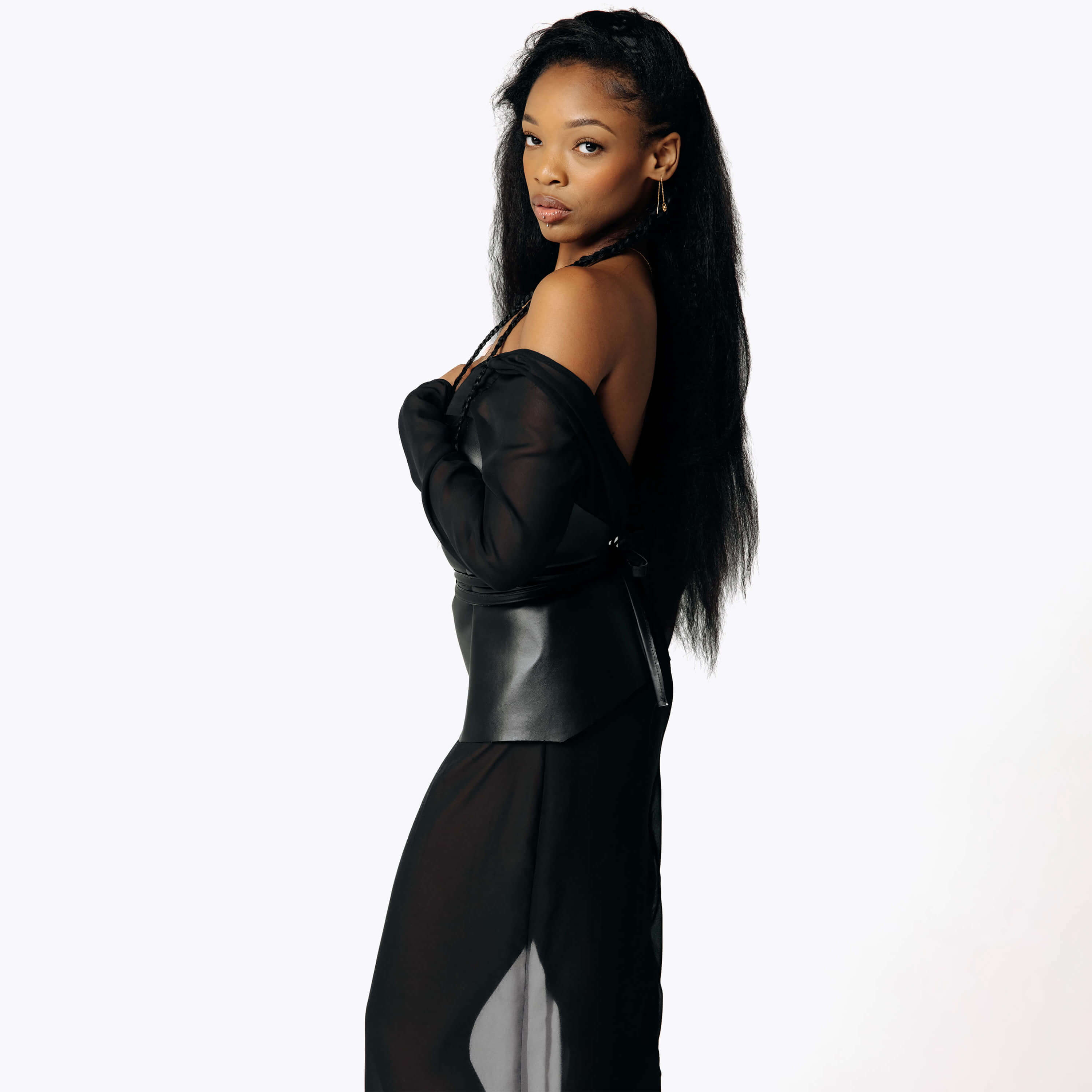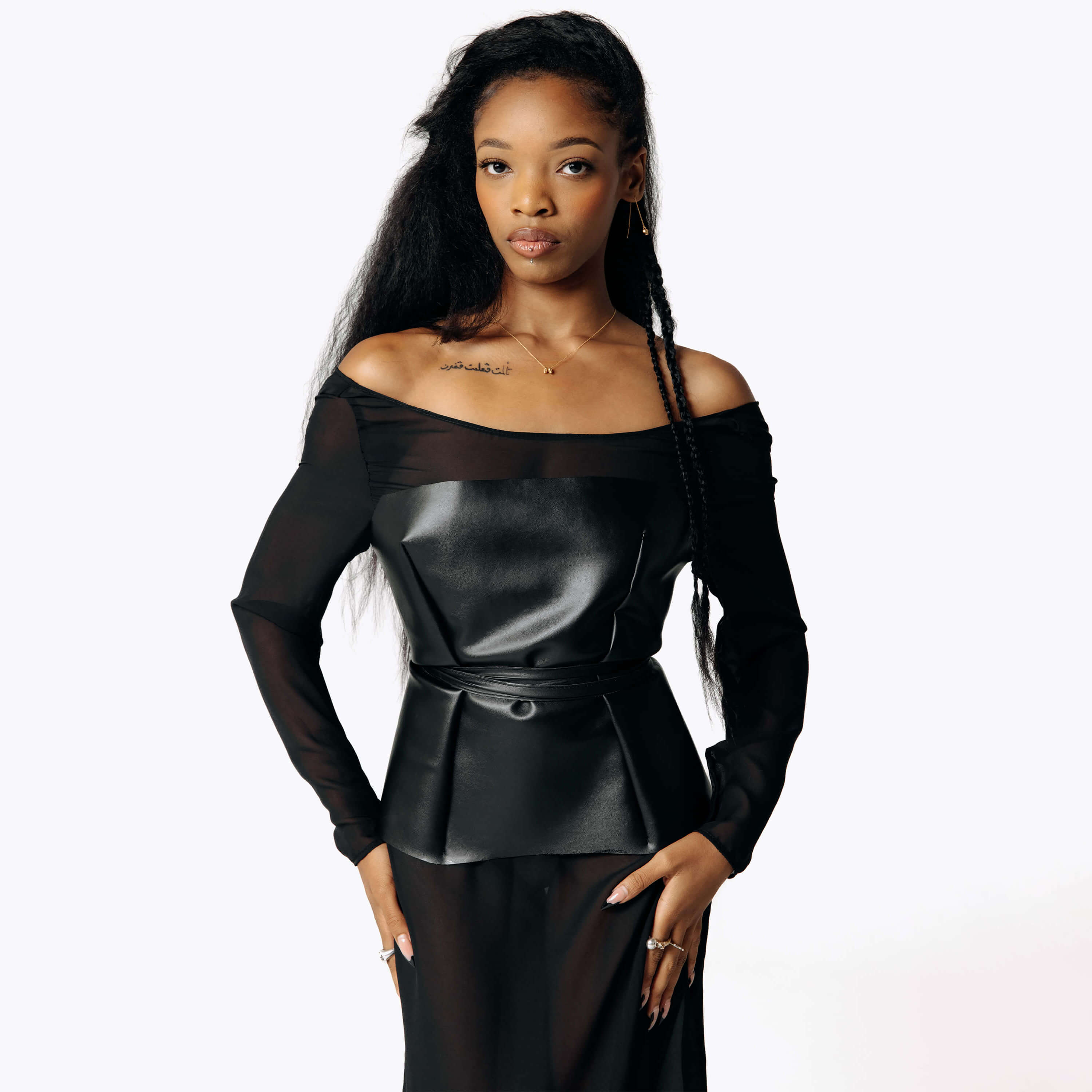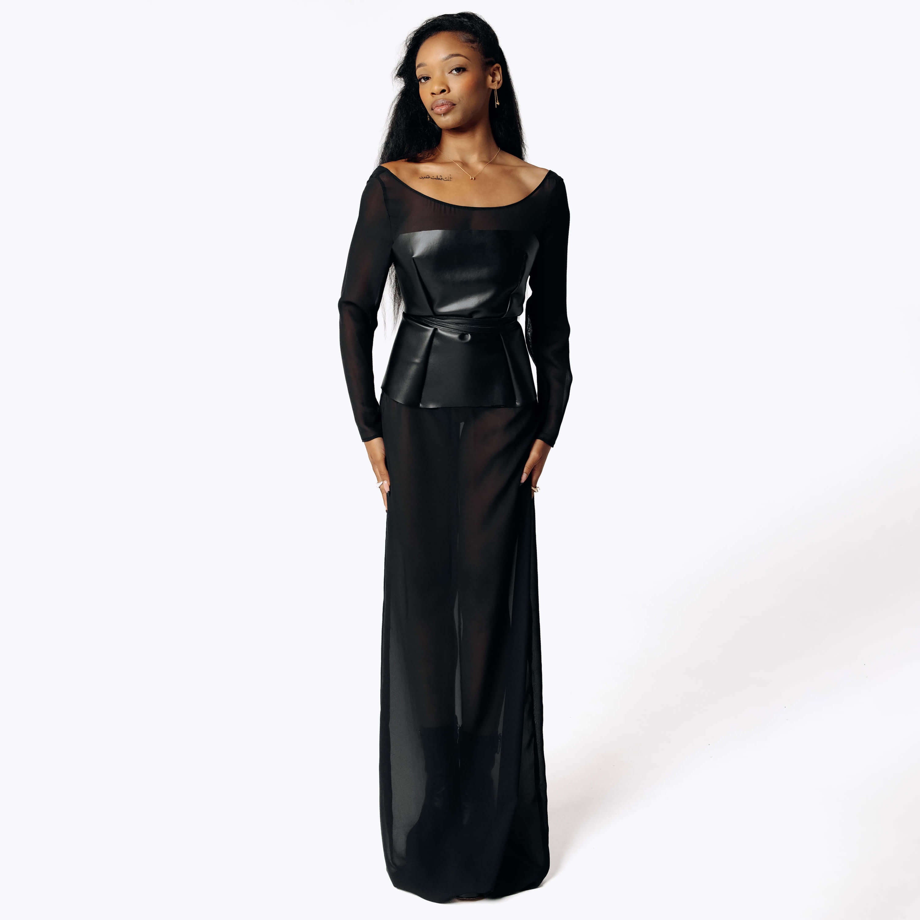The Samhanach Gown, a floor-length sheath of black chiffon that clings only to air. Its boat neckline frames the collarbones with austere grace, while the open back falls away into shadow — a quiet act of rebellion against modesty. Loose-fitting and spectral, the gown is less a garment than a presence, a veil of night draped upon the living. Minimal, ethereal, and untouchable, the Samhanach Gown is a study in absence — a hymn to the elegance of darkness itself.