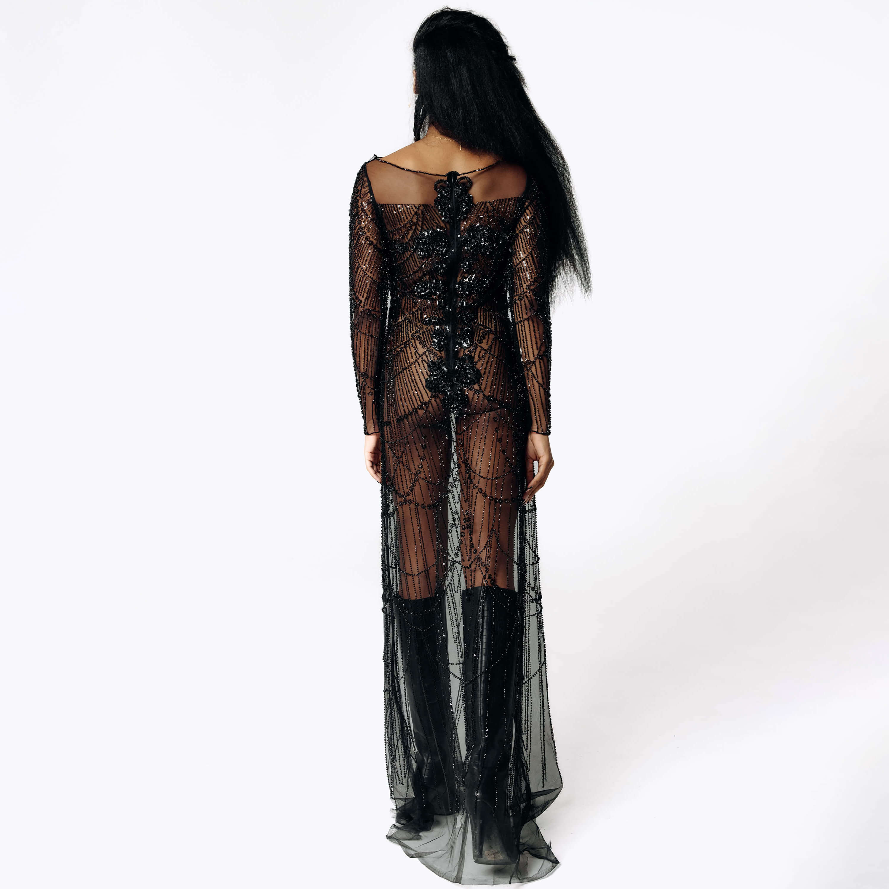 The Thanatos Gown clings like a shadow, sculpted in sheer black beading that whispers across the body with a chilling elegance. Full-length and fitted, it follows every curve before flaring at the hem — a silhouette that calls to mind both cathedral glass and burial shroud. Down the spine, a column of rhinestone appliqué glimmers like vertebrae carved from starlight — a spine of death’s own making. The hand-beaded detailing cascades in dark constellations, creating a gown that is as much an artifact as it is attire. The Thanatos Gown is not for the faint of heart — it is for the dark sovereign, the midnight queen, the soul who understands that beauty is most potent when it walks hand in hand with ruin.